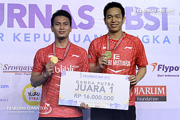 Hendra Setiawan/Mohammad Ahsan (DKI Jakarta/Jawa Tengah) Berfoto Di Podium Juara