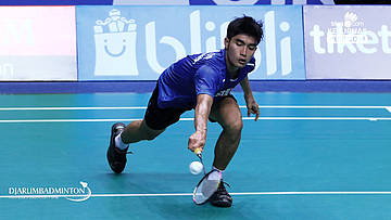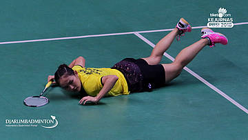 Ruselli Hartawan (Jaya Raya Jakarta) Terjatuh saat mencoba menggapai shuttlecock