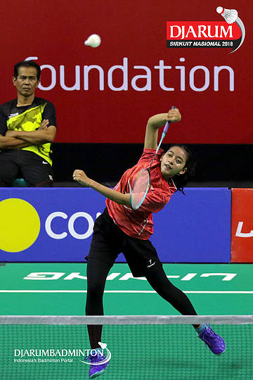 Aldo Ganang Amiranda/Elok Machsunnah (Bayu Kencana, Pasuruan) menyambut shuttlecock