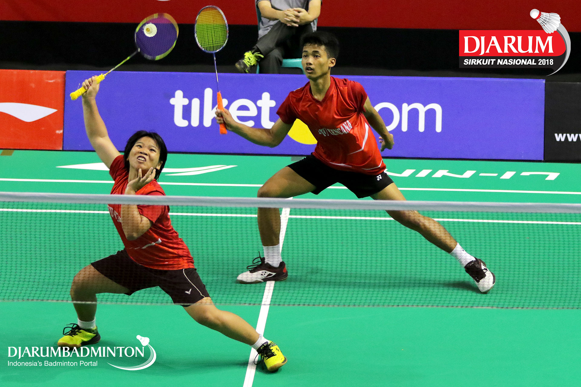 Michael Kaldrian Wiguna/Nathalie Ivyana (Daihatsu Candra Wijaya) berusaha menyambut serangan