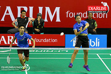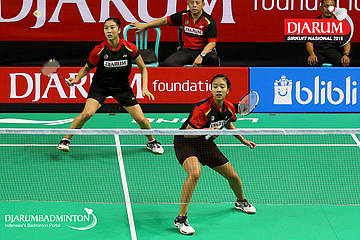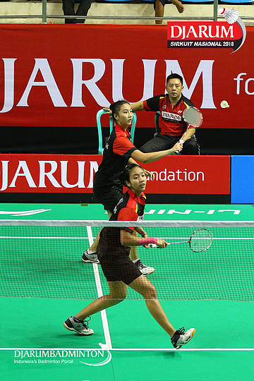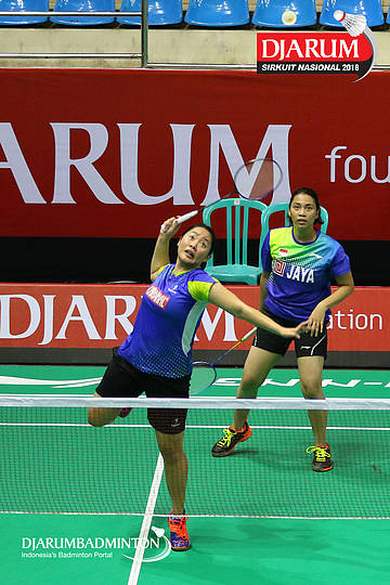Dian Fitriani/Nadiya Melati (Pertamina Fastron, Jakut) bersiap menyambar shuttlecock