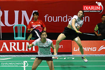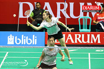 Araki Akane/Imai Riko (Japan) berusaha menyambar pengembalian
