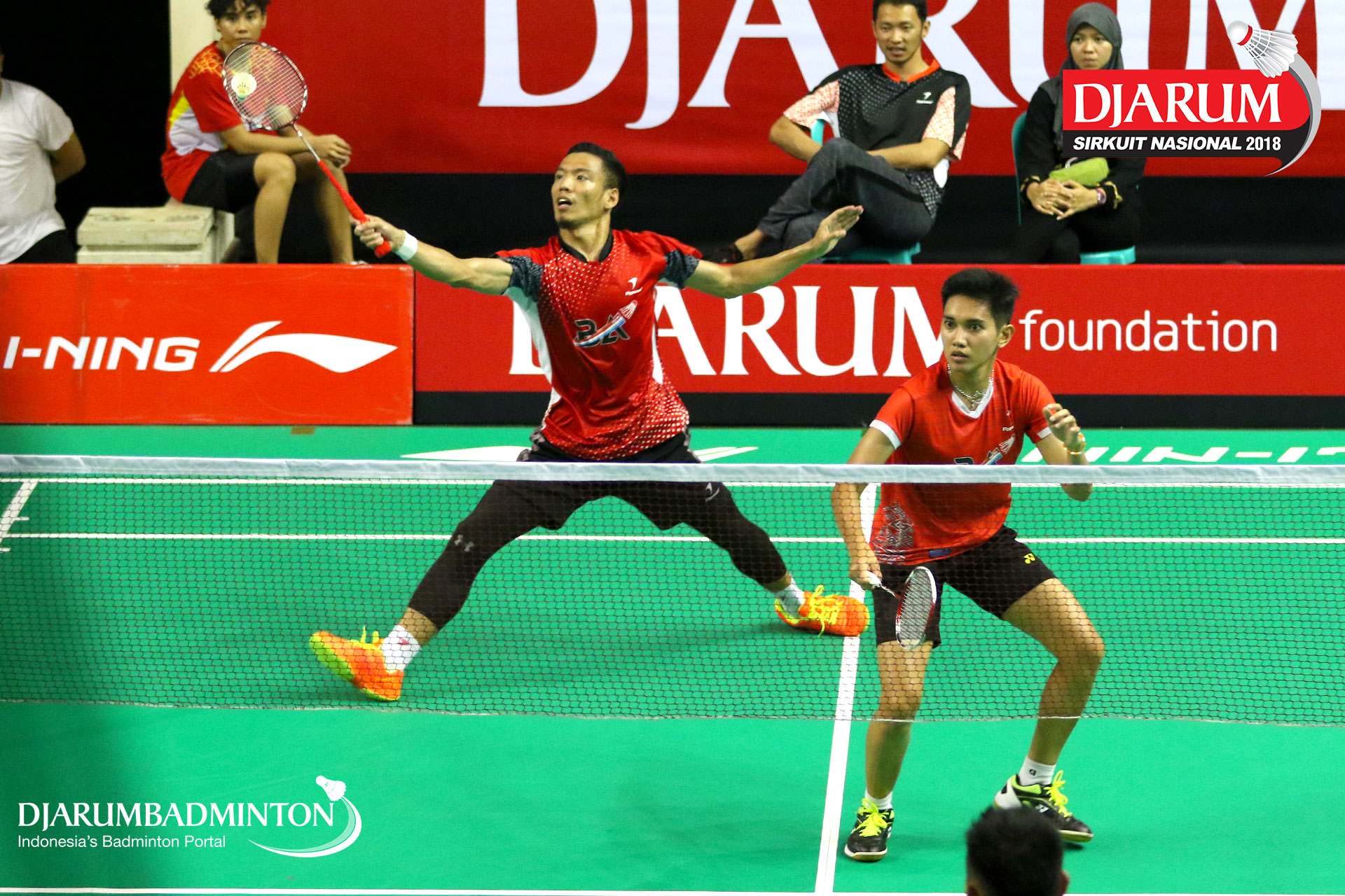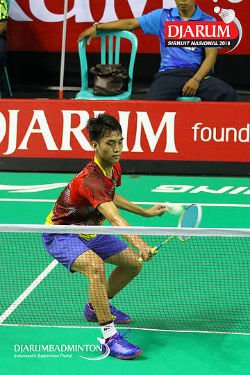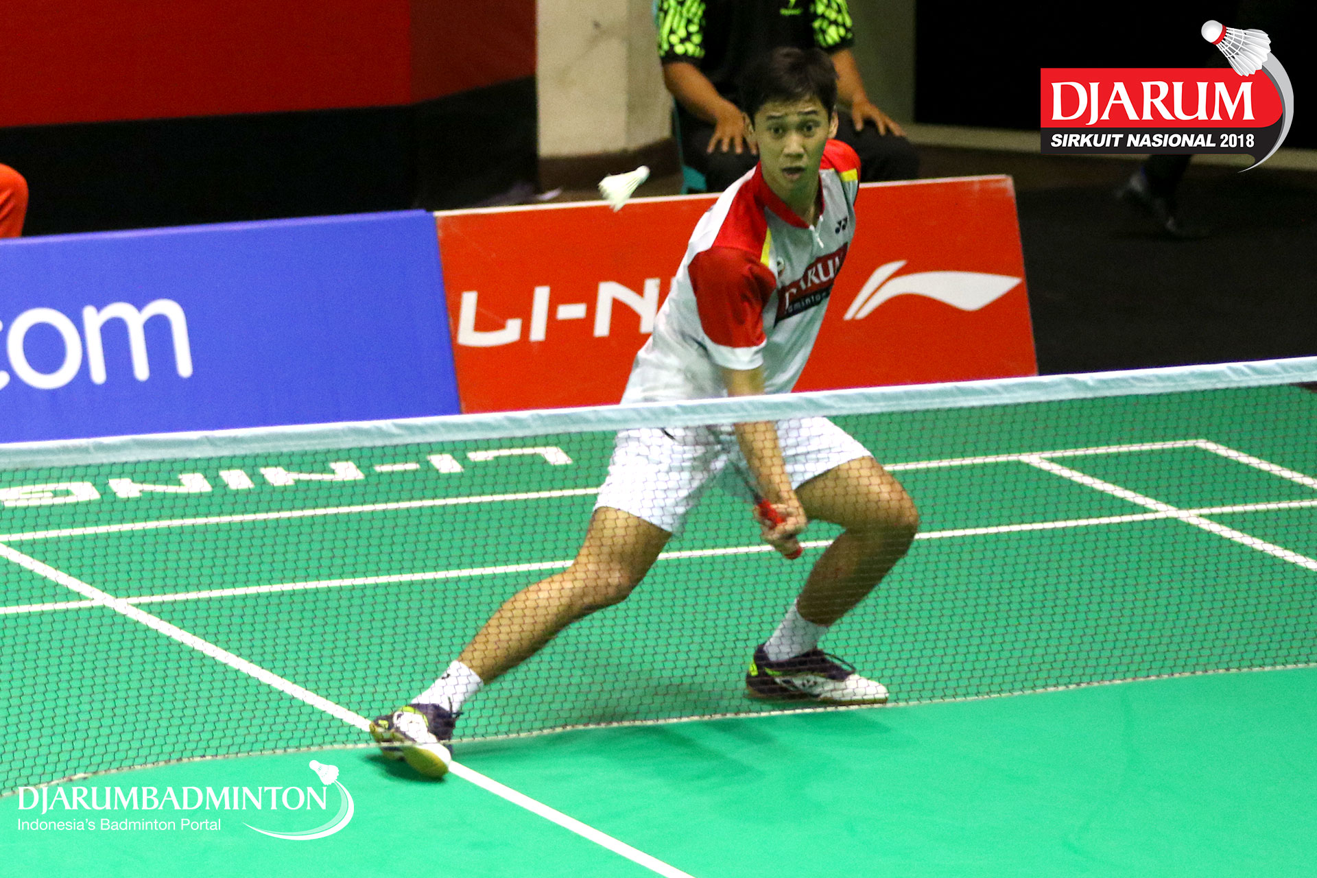 Muhammad Aldo Apriyandi (PB Djarum, Kudus) berusaha mengembalikan serangan