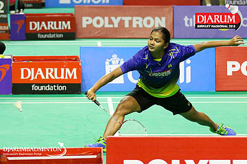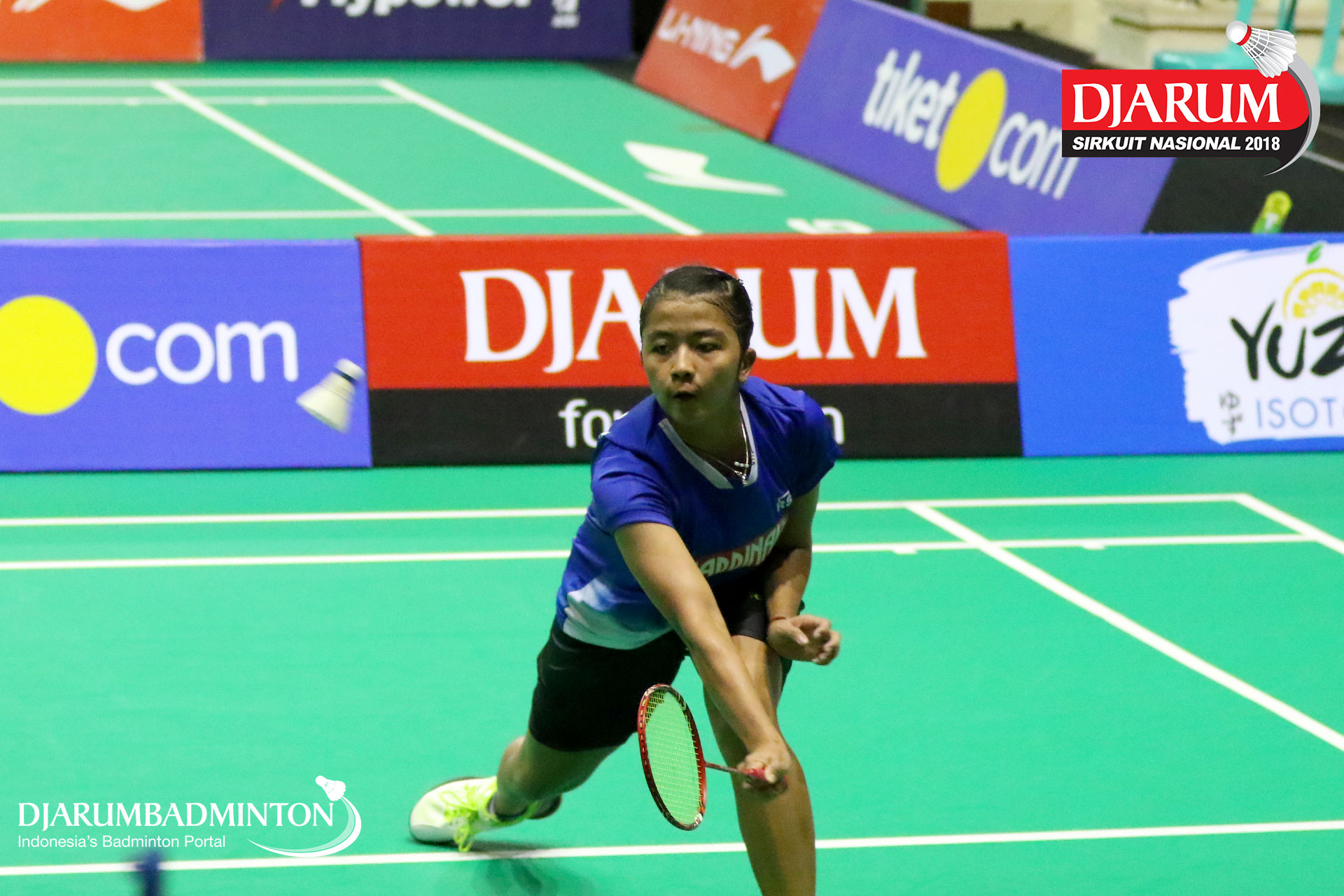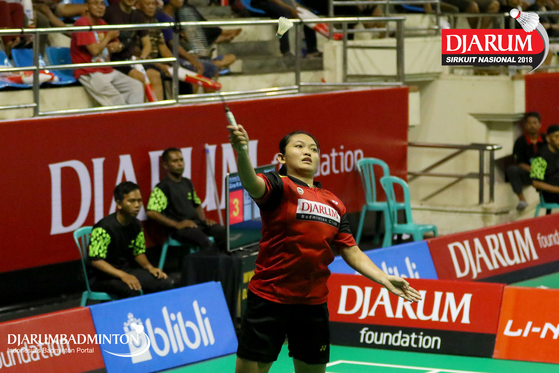 Savira Sandradewi (PB Djarum, Kudus) bersiap mengembalikan shuttlecock
