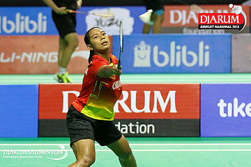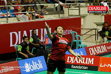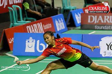 Maria Septiana Wandini Pramesti (Mutiara Cardinal, Bandung) bersiap menyambut shuttlecock