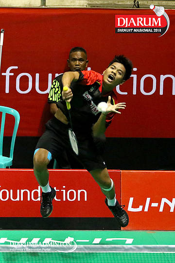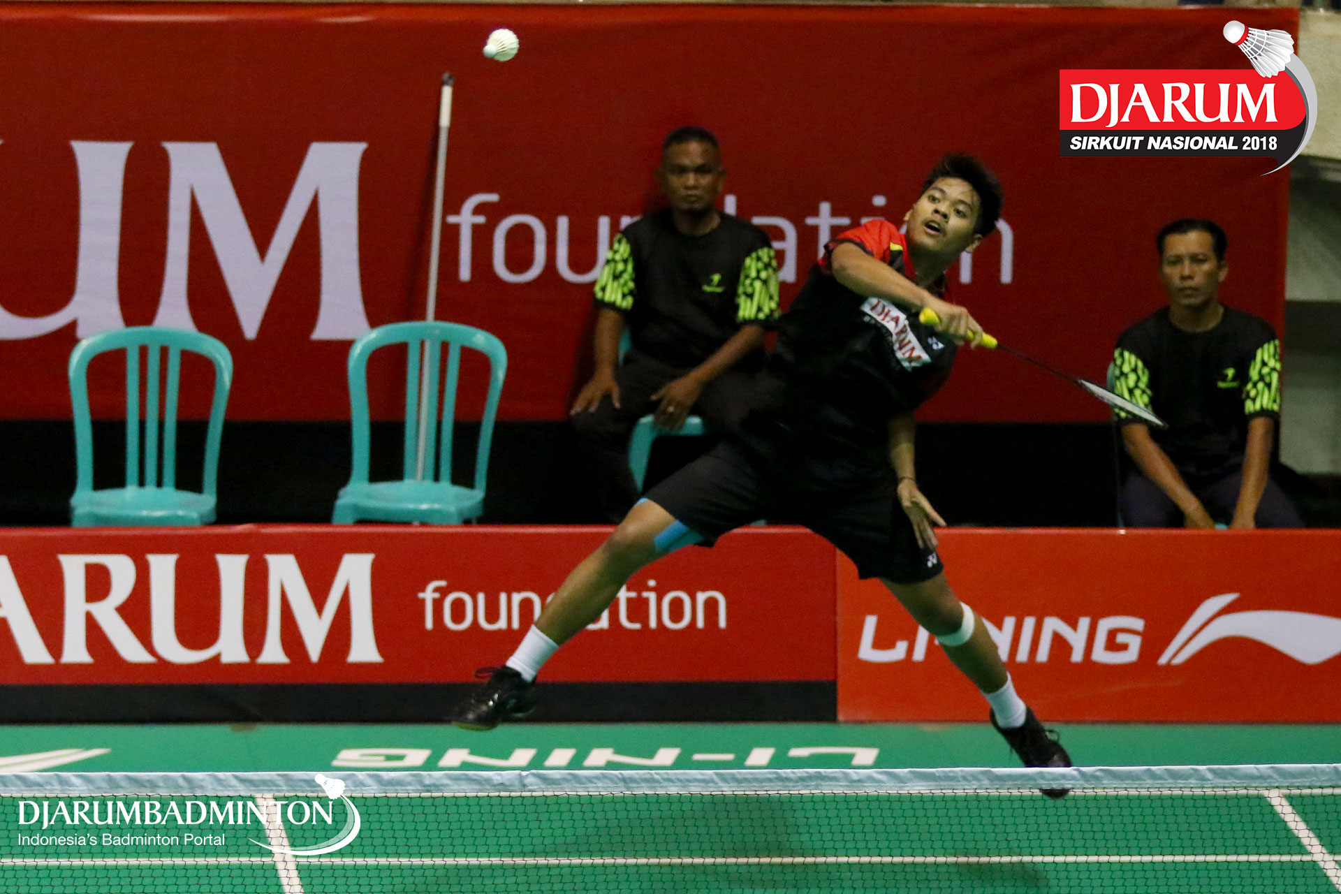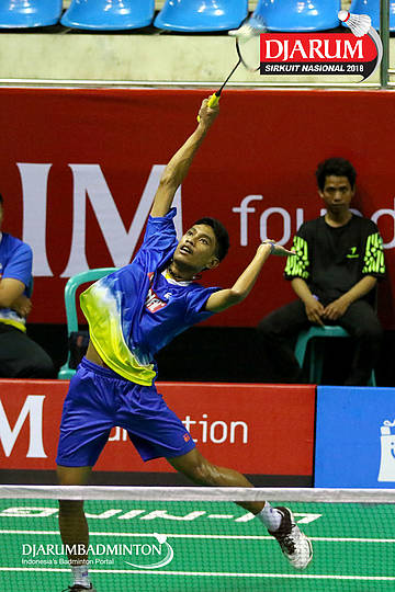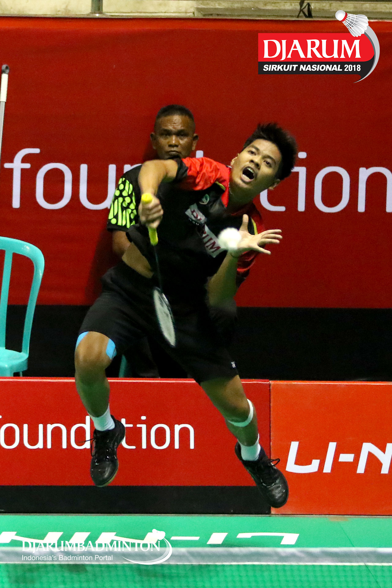 Muhammad Antonio Dhyasz (Mutiara Cardinal, Bandung) menggapai shuttlecock