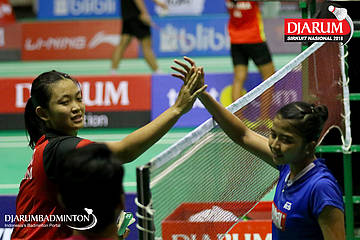 Savira Sandradewi (PB Djarum, Kudus) dan Shabrina Aulia Yasmin (Mutiara Cardinal, Bandung) bersalaman usai bertanding