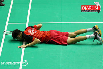 Bobby Setiabudi (PB Djarum, Kudus) terjatuh saat berusaha menggapai pengembalian