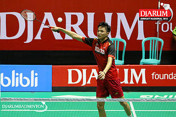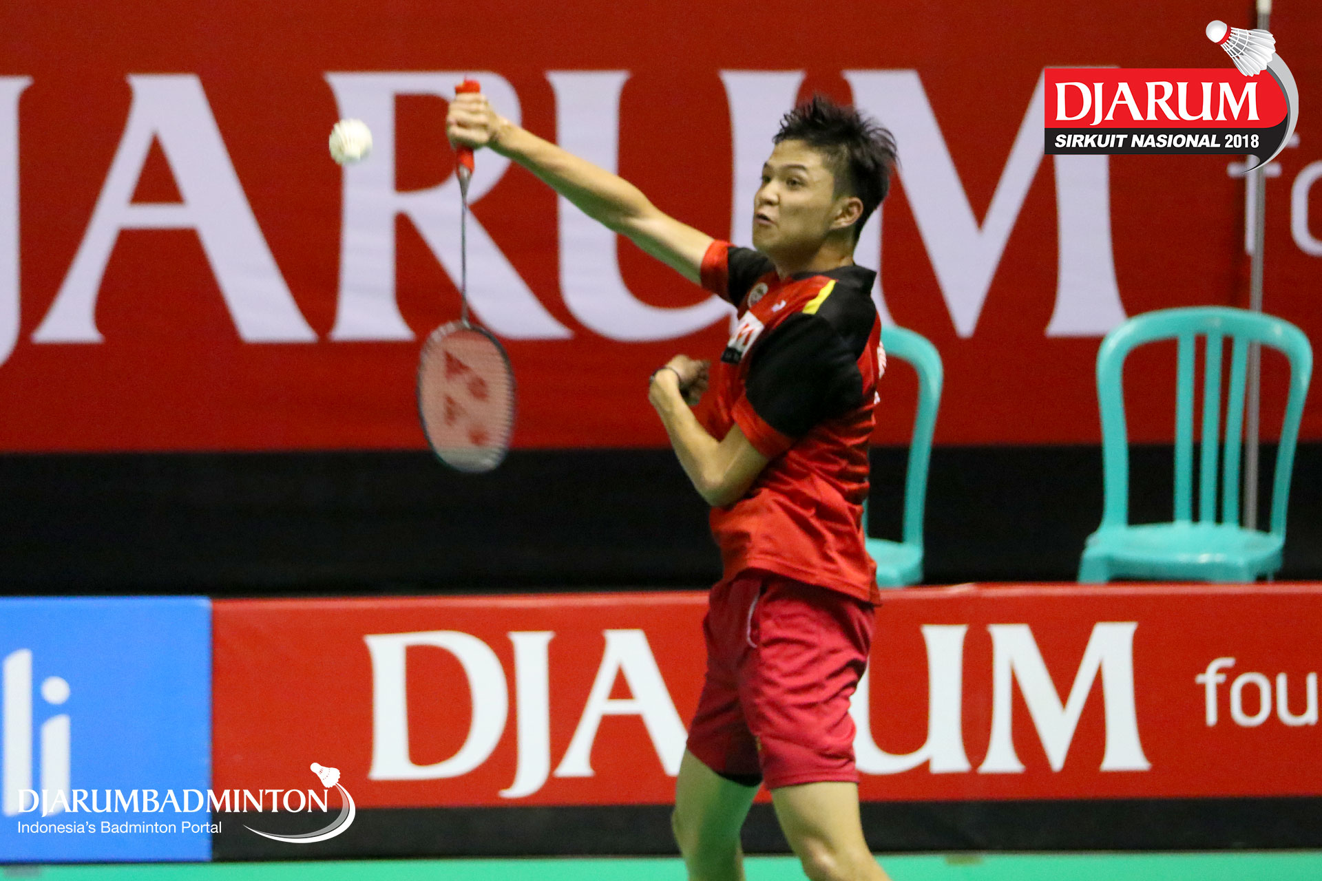 Syabda Perkasa Belawa (PB Djarum, Kudus) melepaskan serangan