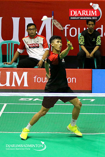 Rezha Akbar Raja Husain Ym (PB Djarum, Kudus) menyambut shuttlecock