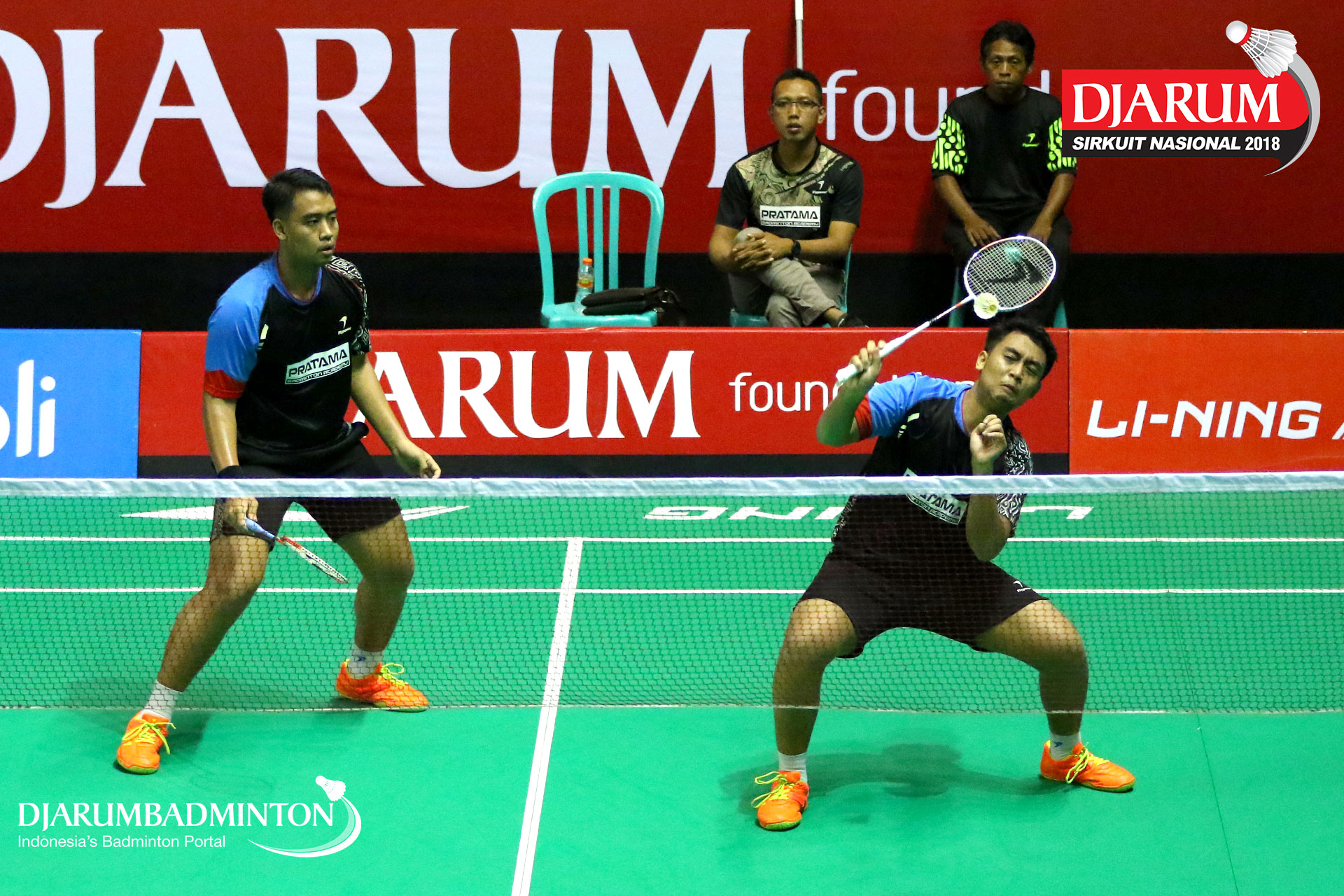 Alfa Rizki Fadlika/Andre Timotius Tololiu (Jaya Raya Jakarta, Jakpus) menyambut shuttlecock