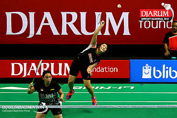 Pia Zebadiahbernadet/Tiara Rosalia Nuraidah (Jaya Raya Jakarta, Jakpus+Mutiara Cardinal, Bandung) bersiap melepaskan serangan