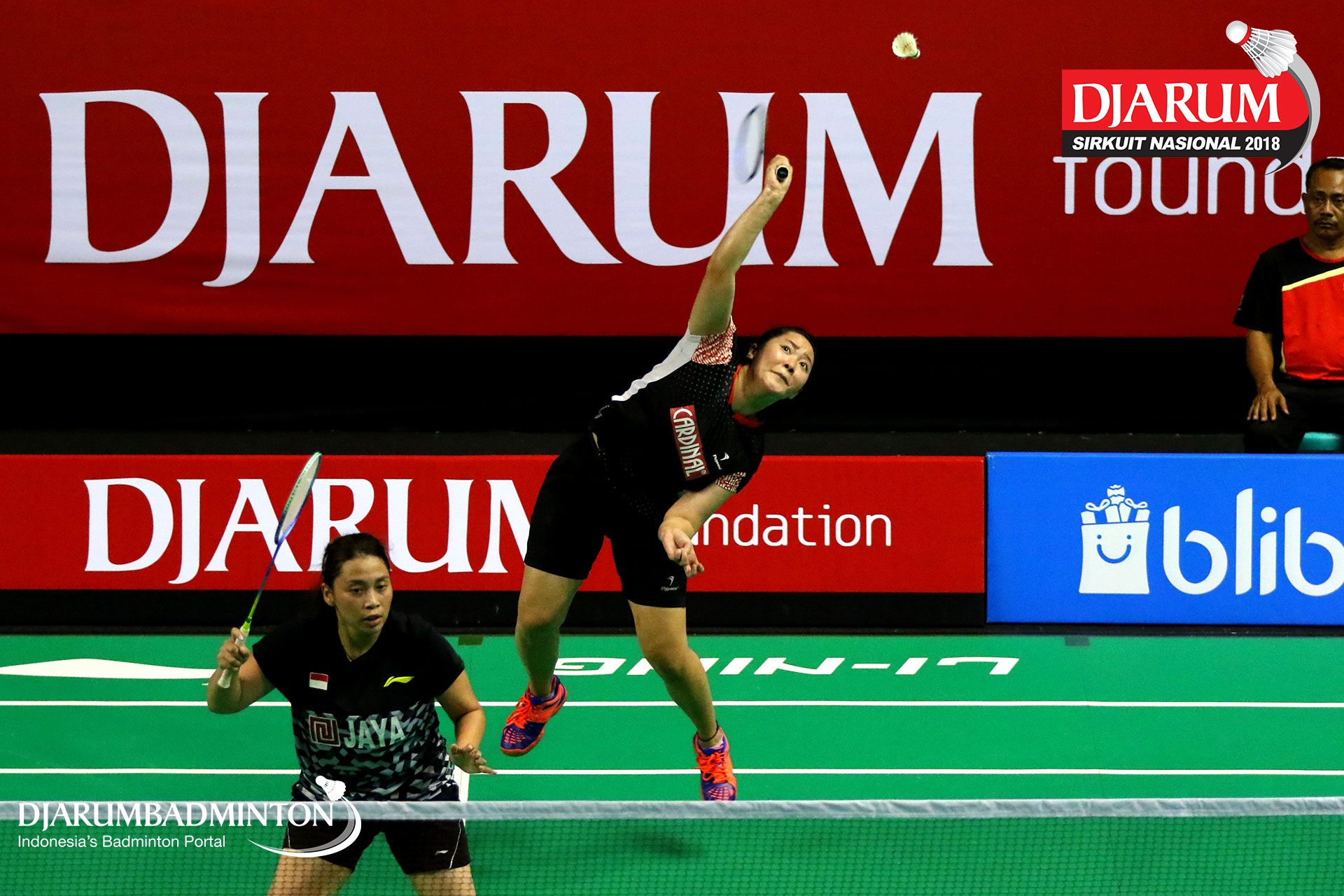 Dian Fitriani/Nadiya Melati (Pertamina Fastron, Jakut) mengembalikan shuttlecock