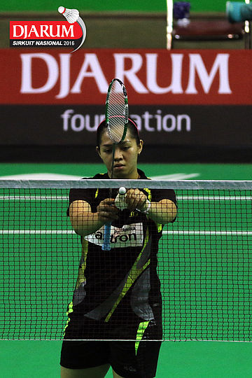 Febby Angguni (Tjakrindo Masters) mengambil shuttlecock yang tersangkut di net