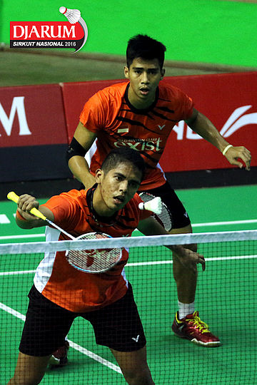 Akbar Bintang/Angger Sudrajat (Djarum Kudus) mengembalikan shuttlecock