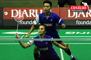 Tedi SUpriadi/Ririn Amelia (Djarum Kudus) bersiap menyambar pengembalian