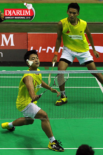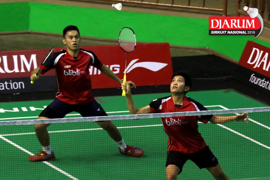 Abiyyu Fauzan/M. Shohibul Fikri (Pusdiklat Telkom) mengembalikan shuttlecock