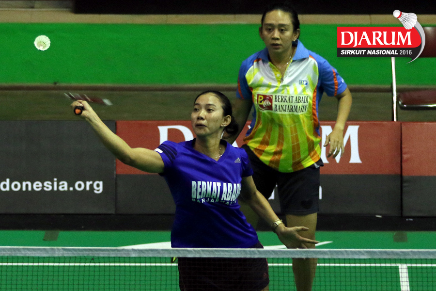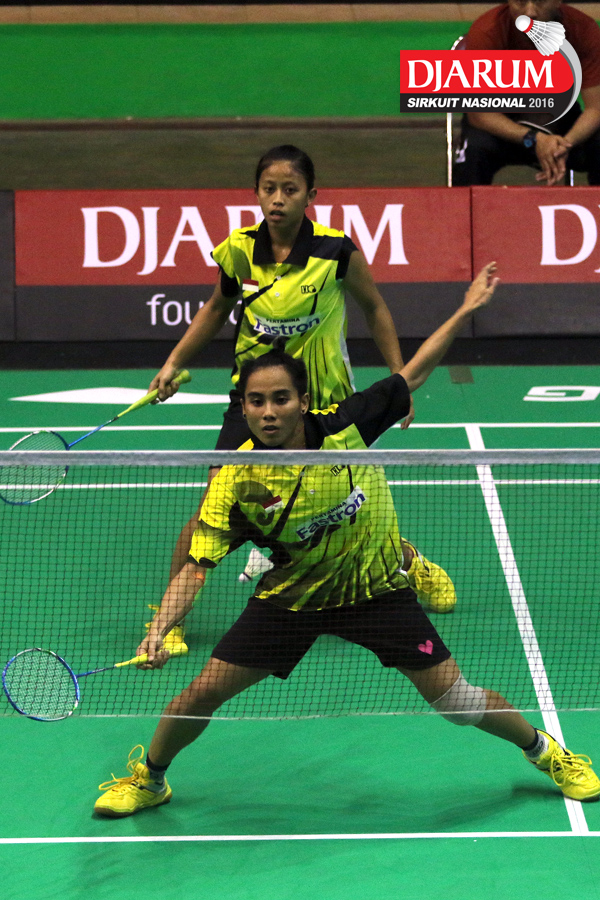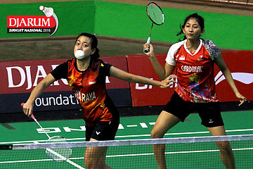 Gebby Ristiyani/Weni Anggraeni (Mutiara Cardinal/Jaya Raya) mengembalikan shuttecock