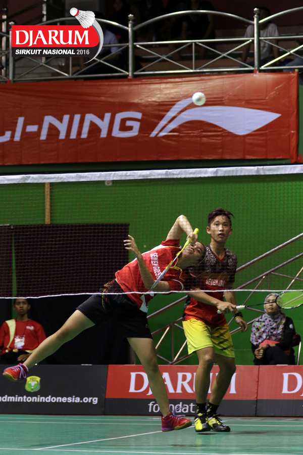 Marcelino Chandra/Aldika Fanisha Gea (Semen Gresik) Mengembalikan Shuttlecock.