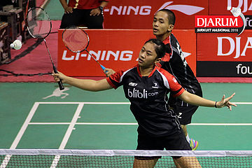 Ade Yusuf/Aprilia Yuswandari (Hi Qua Wima/Semen Gresik) Mengembalikan Shuttlecock.
