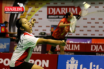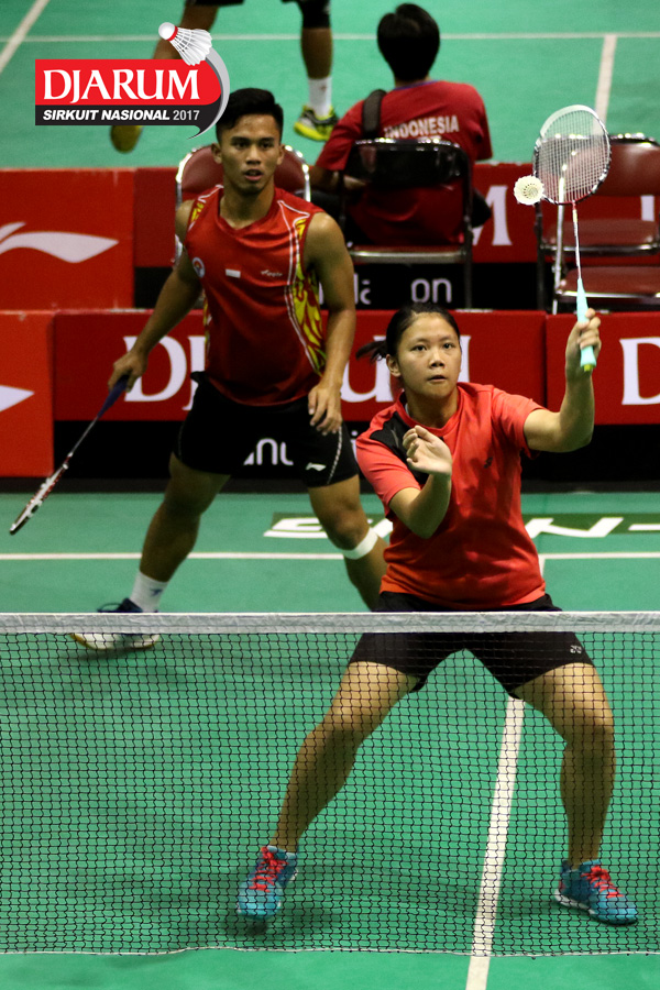 Tedi Supriadi/Devi Tika Permatasari (Djarum Kudus/Berkat Abadi) Mengembalikan Shuttlecock