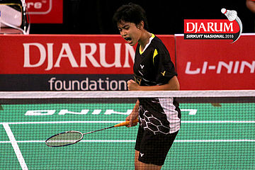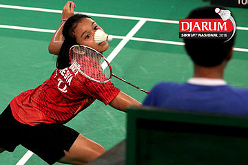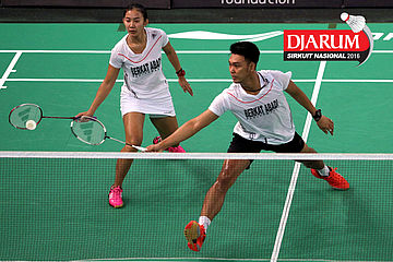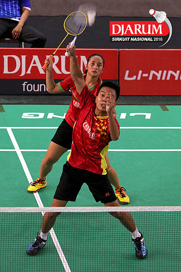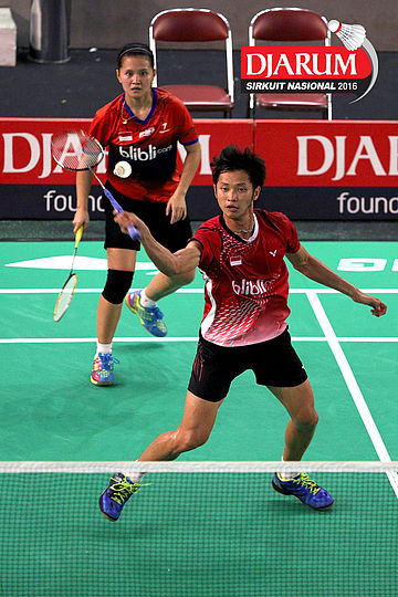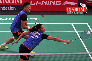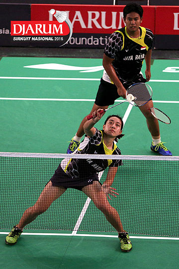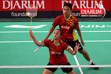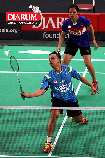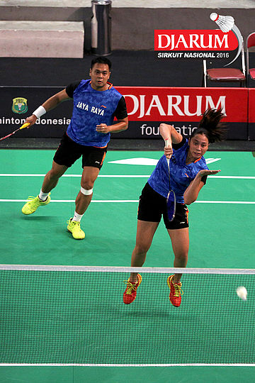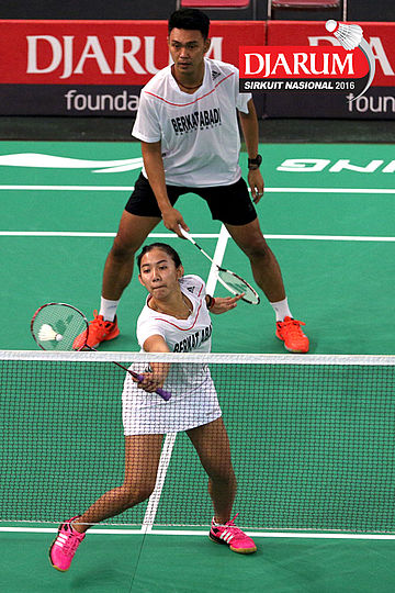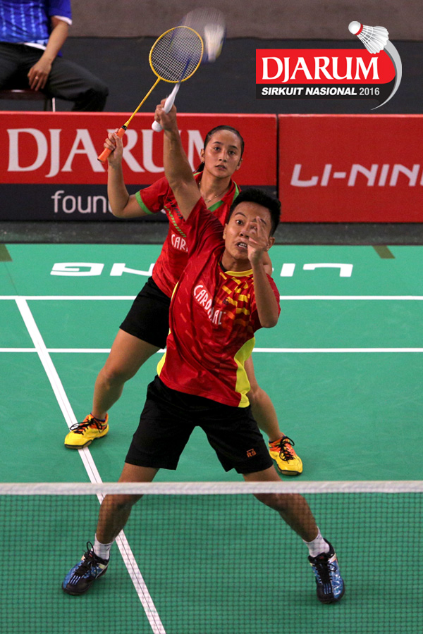 Fran Kurniawan/Komala Dewi (Djarum Kudus) bersiap menyambar pengembalian tanggung.