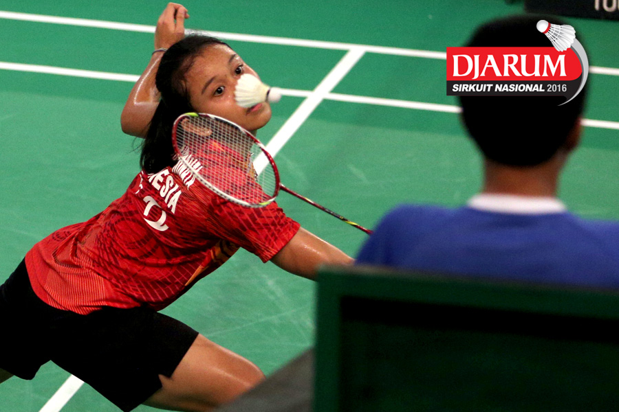 Aurum Oktavia (Jaya Raya) mengembalikan shuttlecock