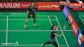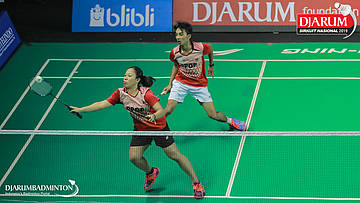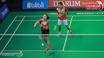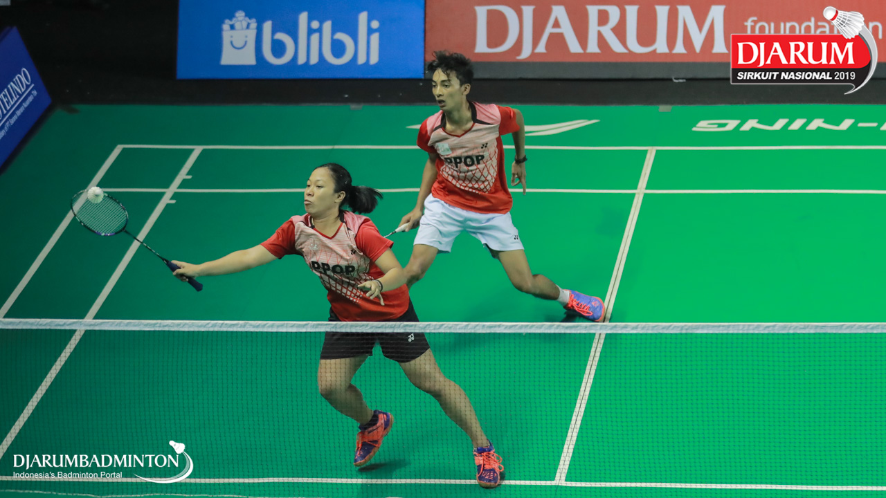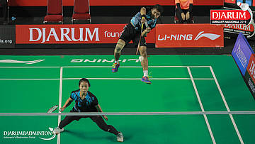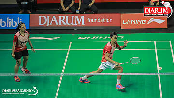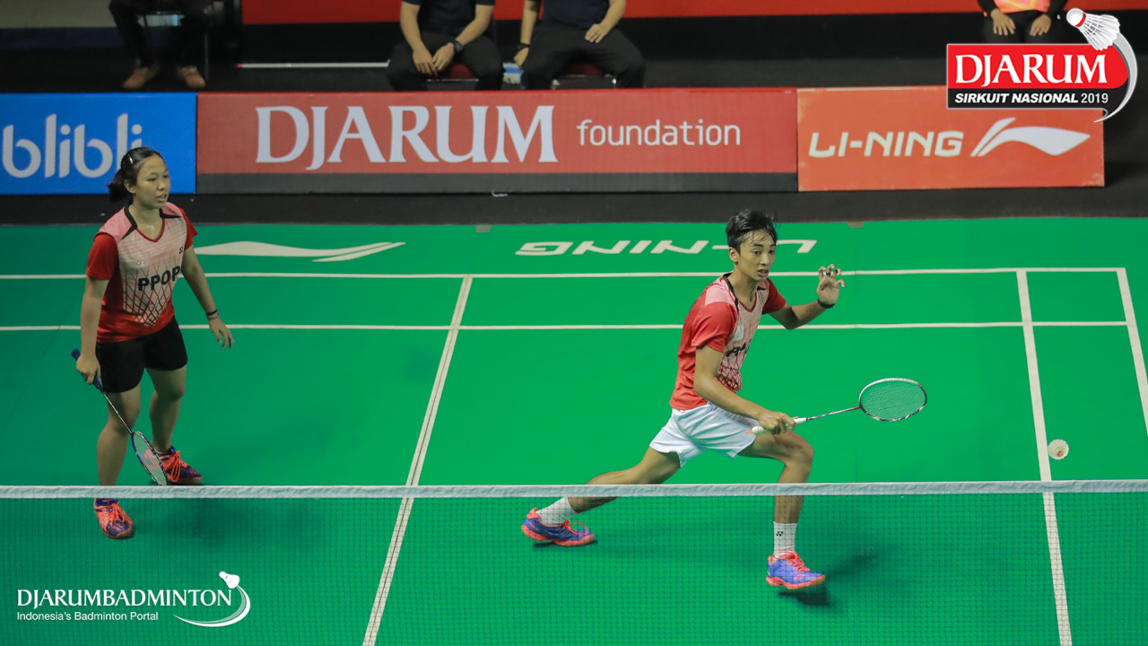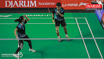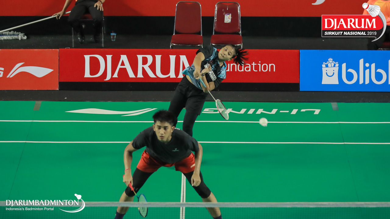 Muhammad Rendy+Adisti Rahayu (Jaya Perkasa, Barito) bersiap menyambut shuttlecock