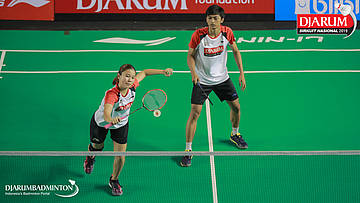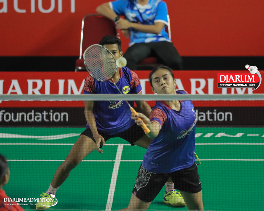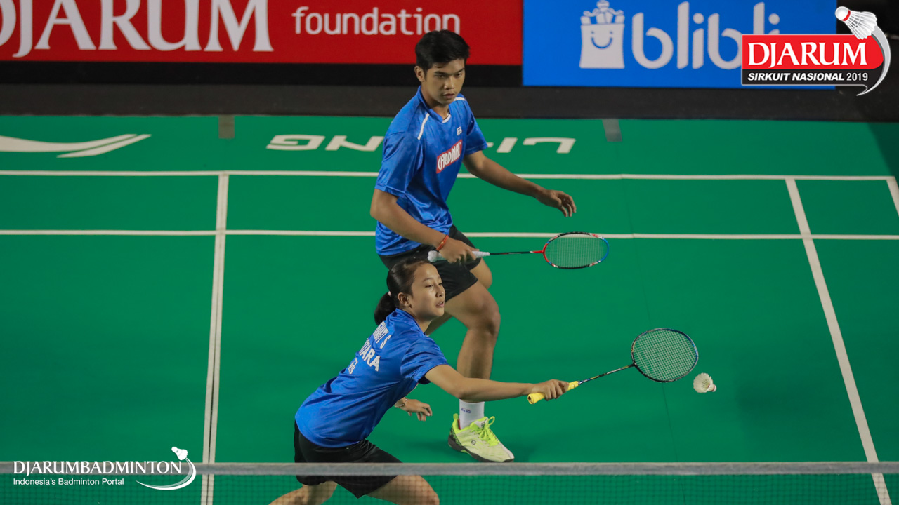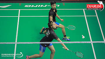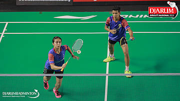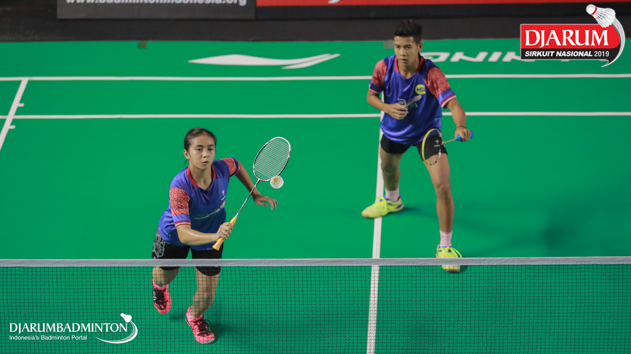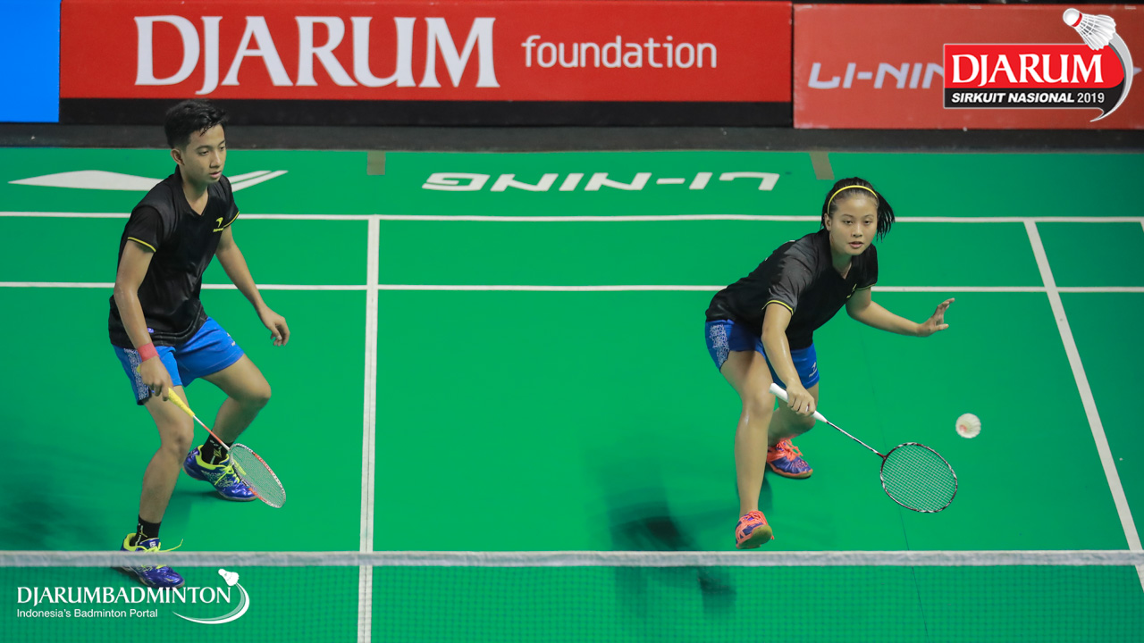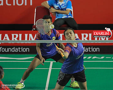 Ari Kusuma+Salsabila Dewanti (Mutiara Cardinal, Bandung) menyambut shuttlecock