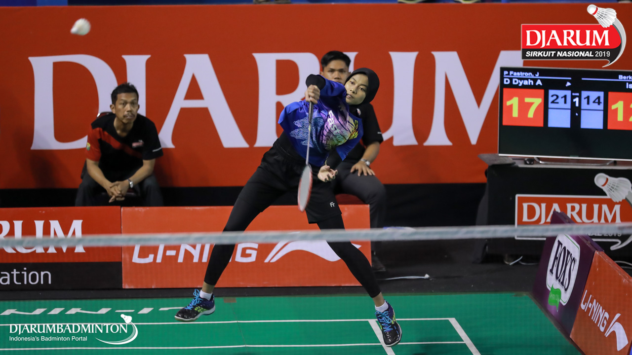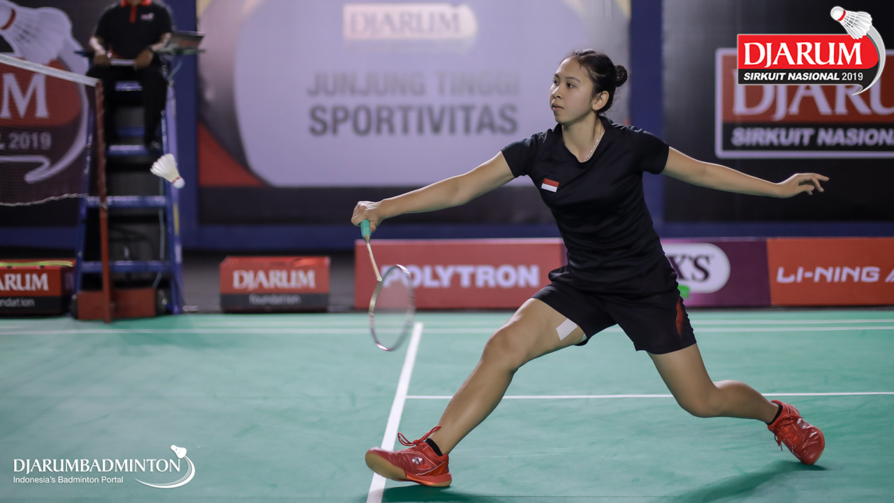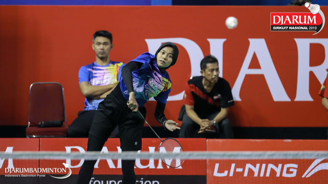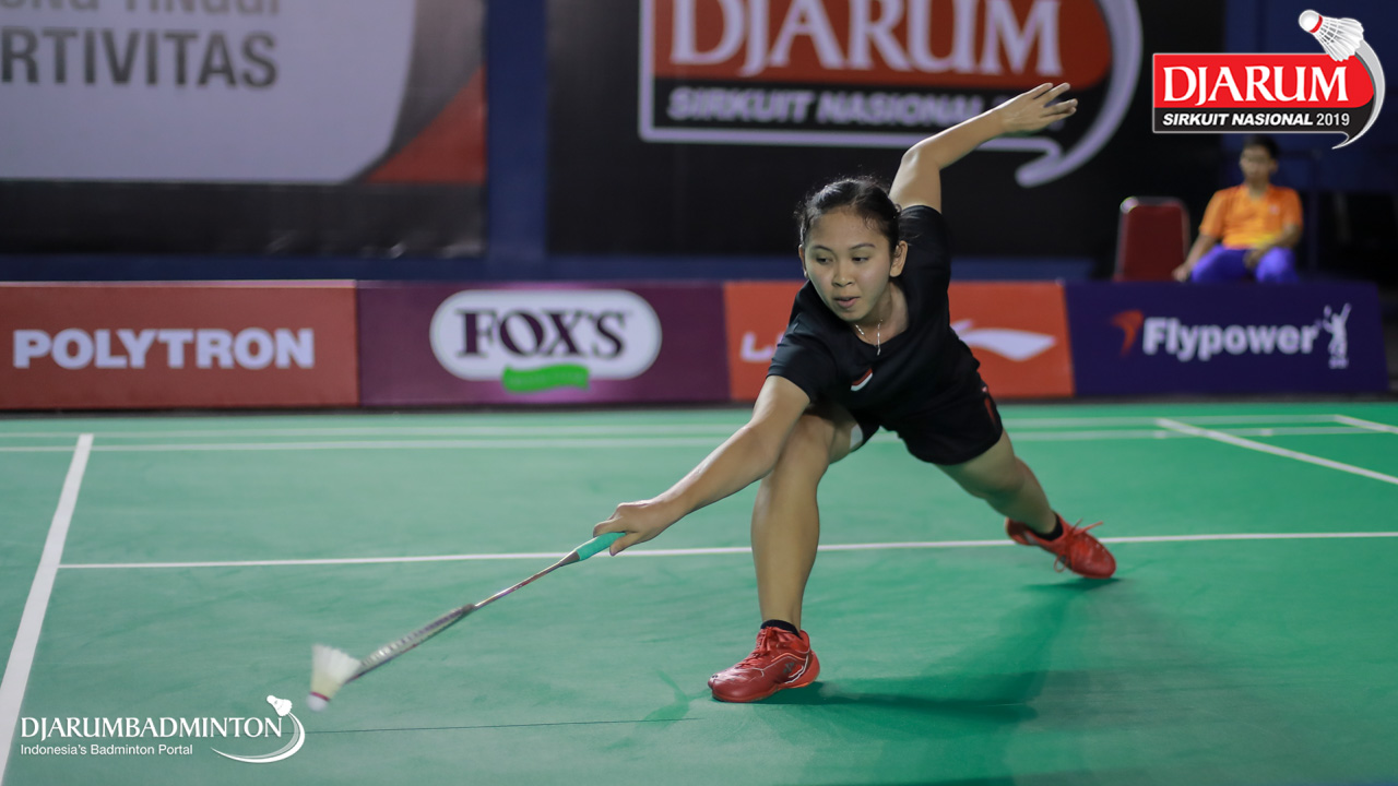 Dinar Dyah Ayustine (Pertamina Fastron, Jakut) menggapai shuttlecock