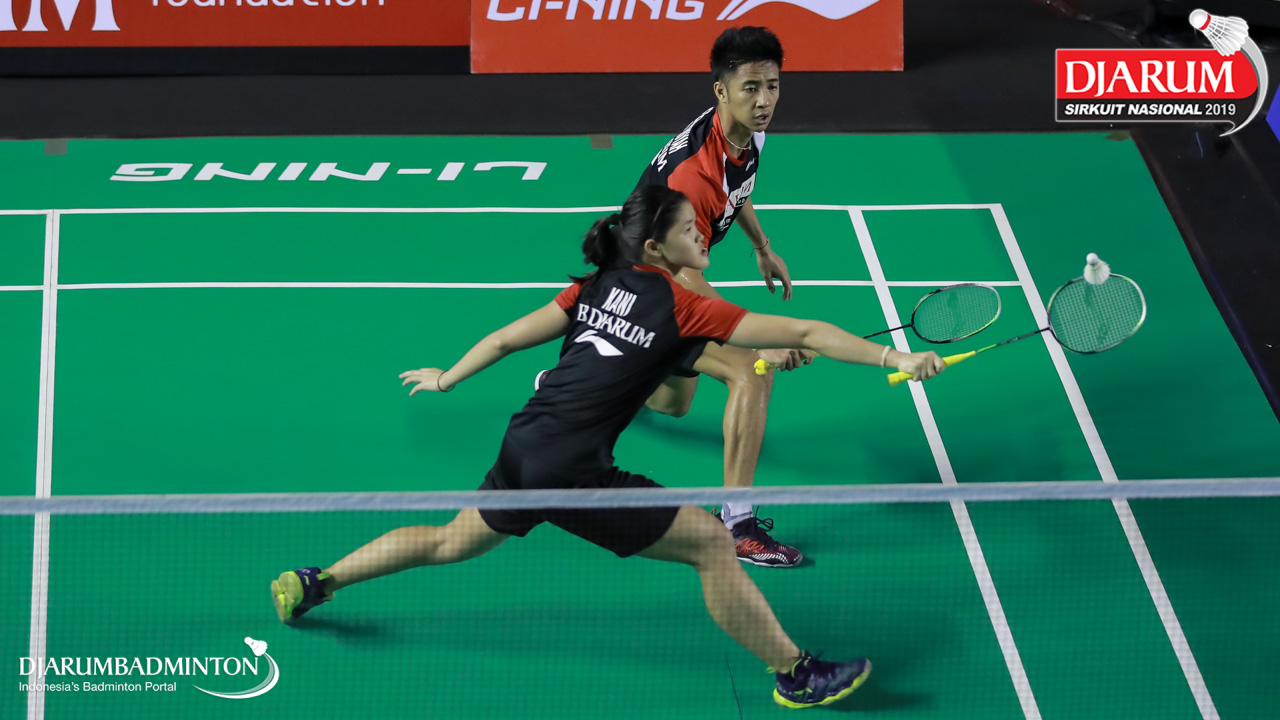 Dejan Ferdinansyah+Serena Kani (PB Djarum, Kudus) berusaha menggapai shuttlecock