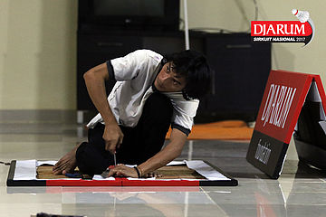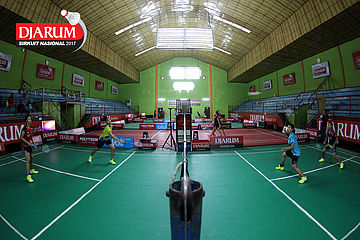 Seorang Pekerja Saat Memasang Perangkat Pertandingan Djarum Sirkuit Nasional Li-Ning Kalimatan Timur Open 2017