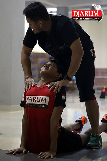 Salah Satu Pebulutangkis Djarum Kudus Melakukan Peregangan Usai Bertanding