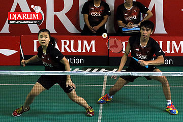 Ricky Riyanto/Sima Fatma (ISTC/SKO Ragunan) Mengembalikan Shuttlecock