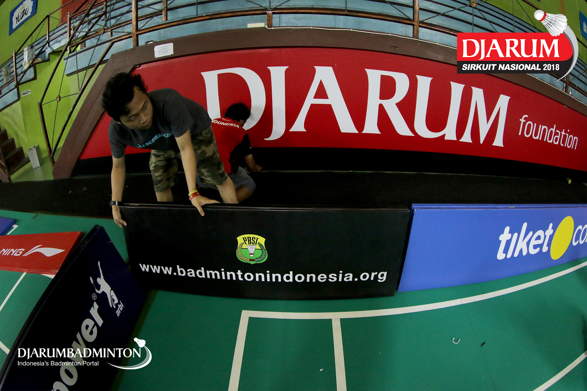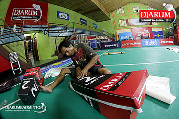 Salah satu pekerja sedang mengerjakan perlengkapan logistik Djarum Sirkuit Nasional Kalimantan Timur Open 2018