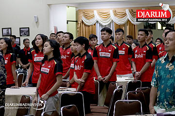 Para atlet PB Djarum Kudus saat menyanyikan lagu Indonesia Raya