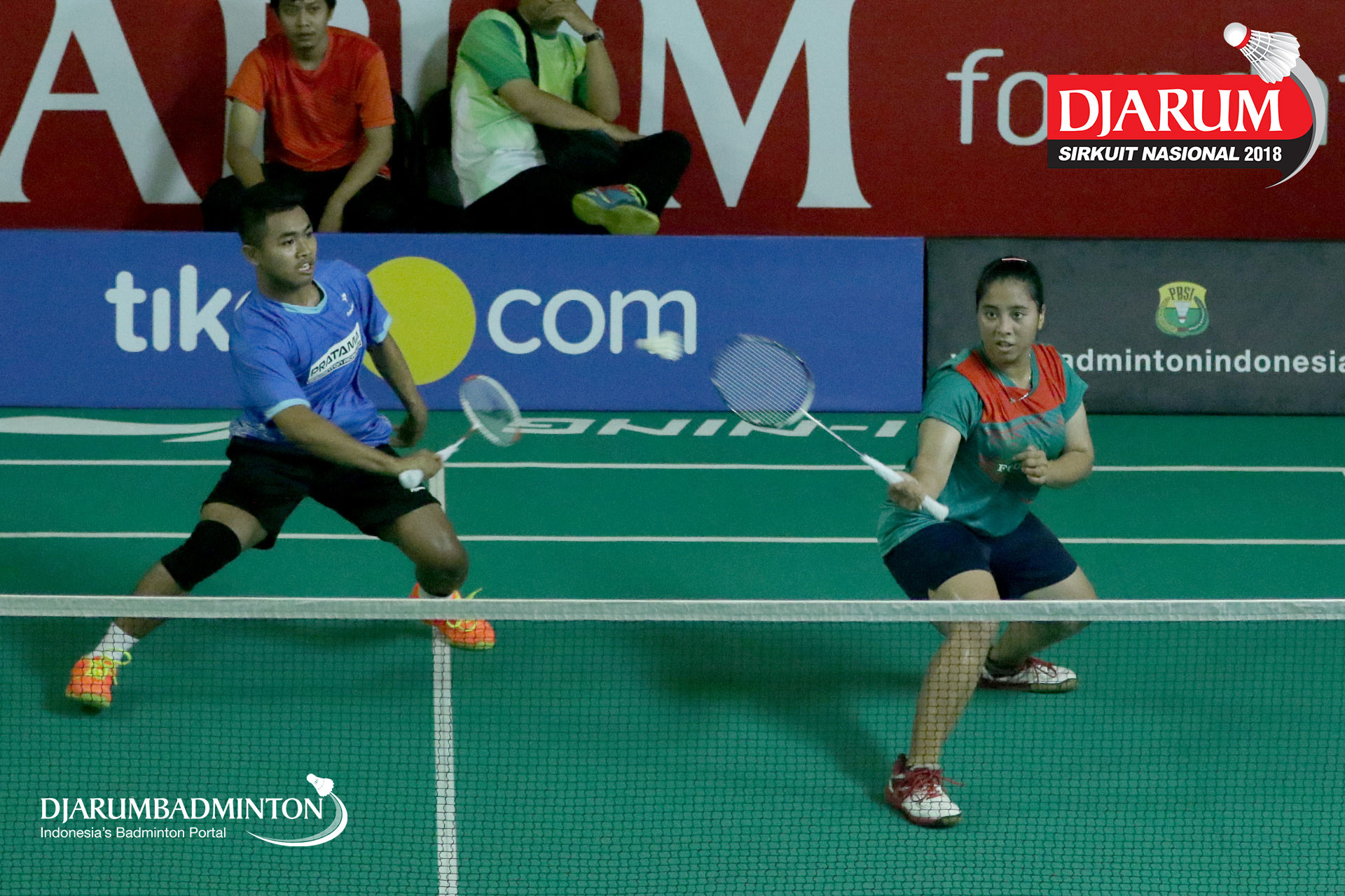 Muliadi Rizka Saputra/Arin Apriyanti (Pratama Badminton Academy, Surabaya/PB Suryanaga Wima, Surabaya) mengembalikan shuttlecock