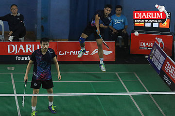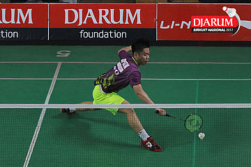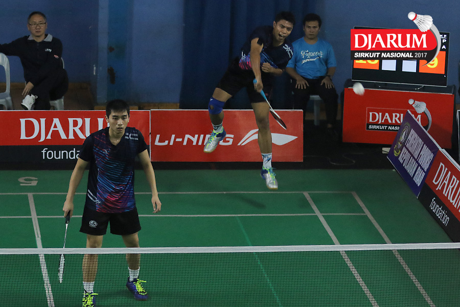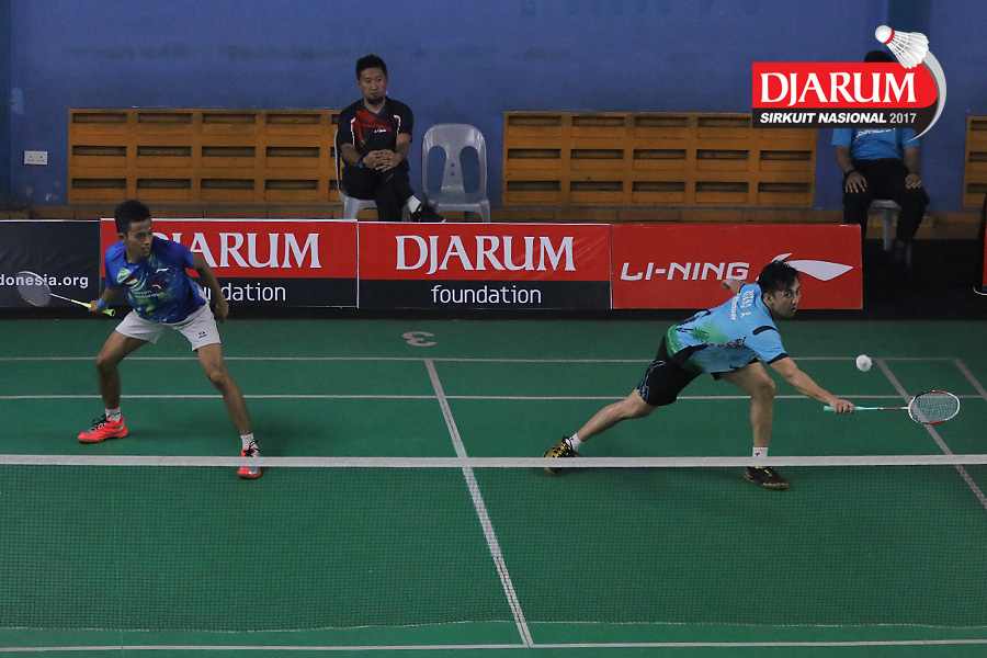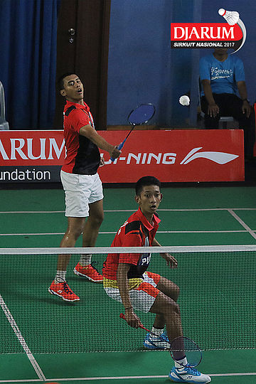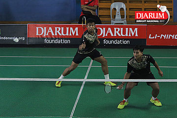 Ihsan Adam Wirawan/Rizko Asuro (Guna Dharma Bandung/Pertamina Fastron) Mengembalikan Shuttlecock