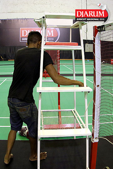Salah satu petugas saat mempersiapkan perangkat kursi Umpire