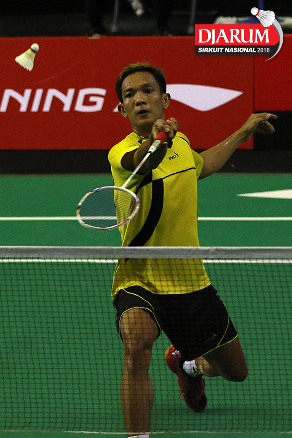Randi Prakasa (Pelatprov Sulsel) mengembalikan shuttlecock