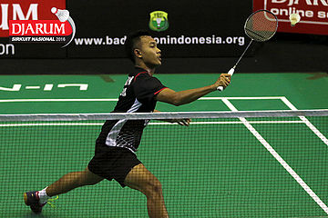 Yohanes Kevin (Mutiara Cardinal) mengembalikan shuttlecock