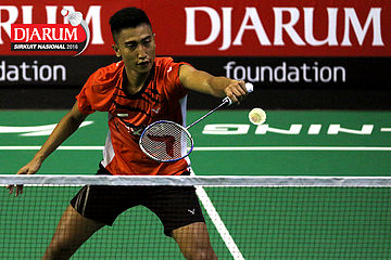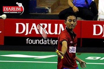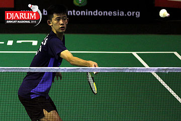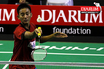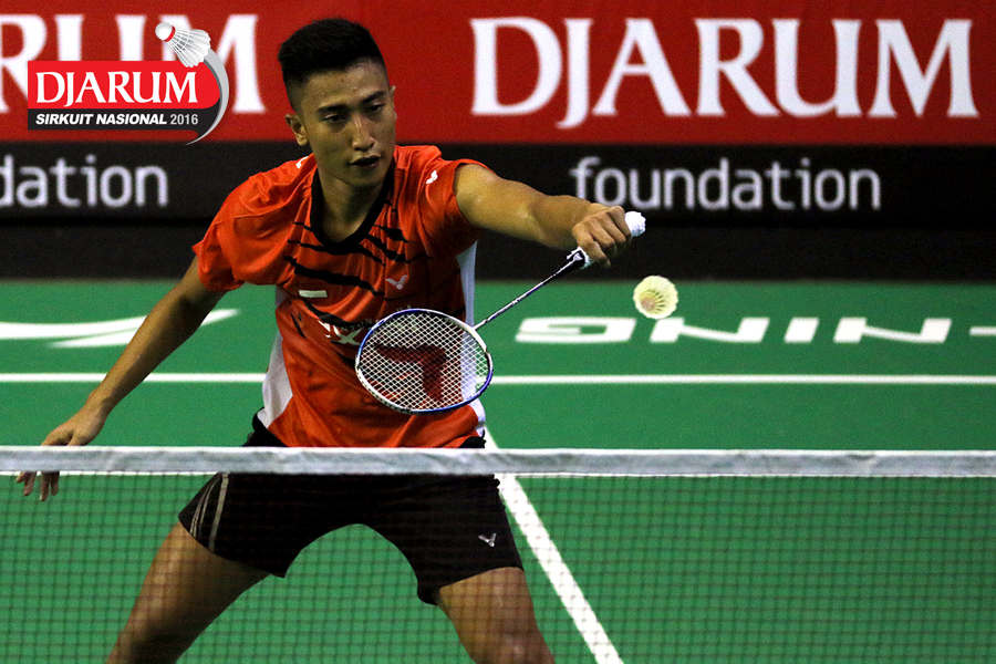 Vero Wisnu (Djarum Kudus) mengembalikan shuttlecock