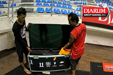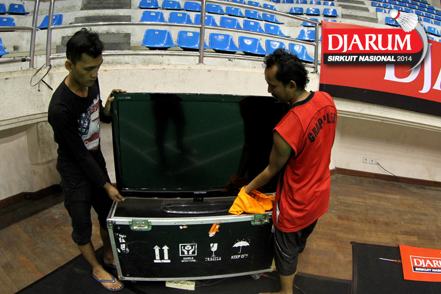 Dua orang pekerja sedang merapikan stand live score untuk para umpire