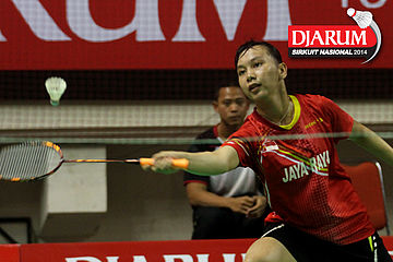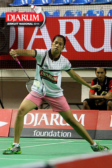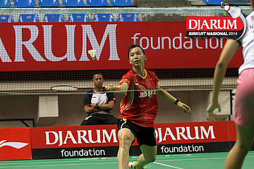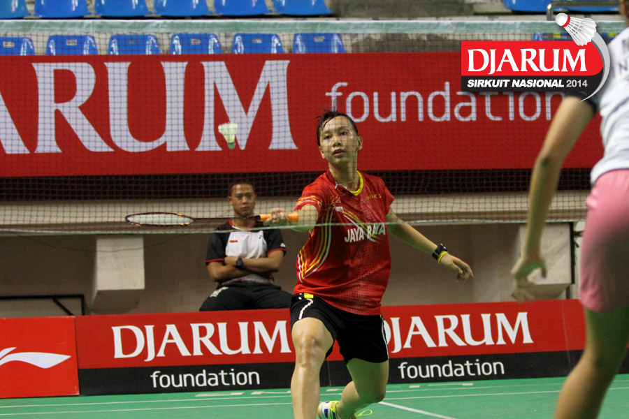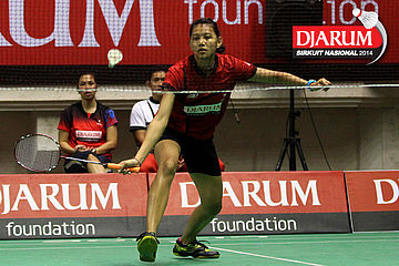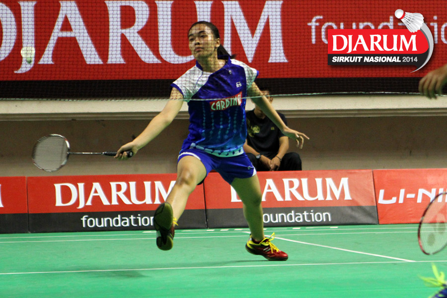 Gabriel Meilani M (JAYA RAYA JAKARTA) mengembalikan shuttlecock ke arah Melisa Andesti (DJARUM KUDUS)