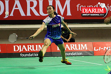 Devi Yunita Indah (DJARUM KUDUS) mencoba menggapai shuttlecock