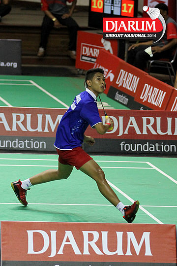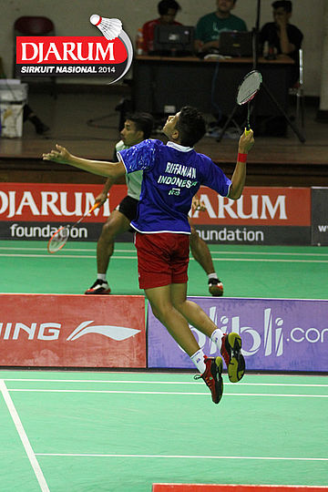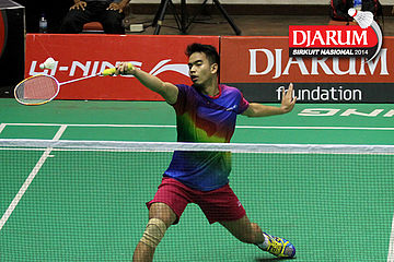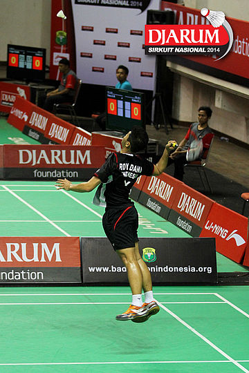 Indra Setiawan (PERTAMINA INDONESIA) mencoba menggapai shuttlecock