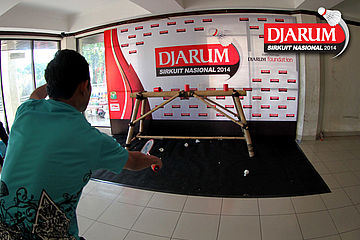 Seorang pengunjung sedang mencoba games yang di tersedia di dalam GOR Lila Bhuana