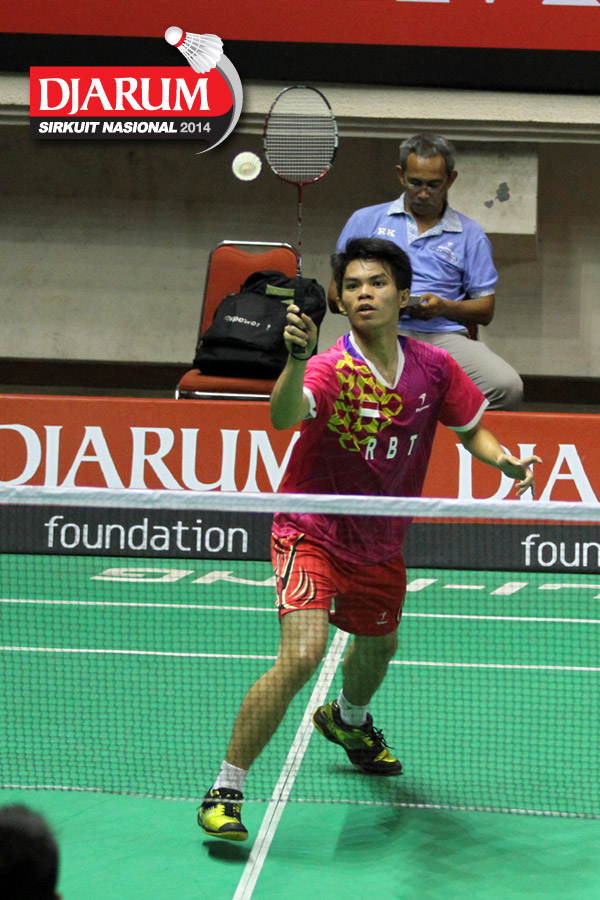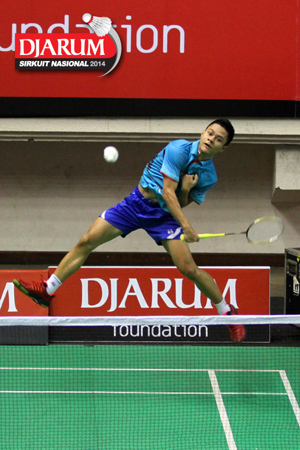 Endru Tampi (TANGKAS JAKARTA) mencoba menggapai shuttlecock