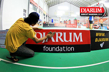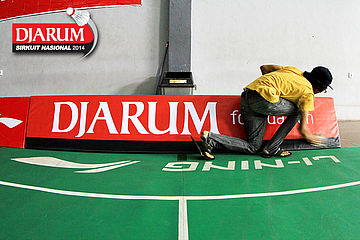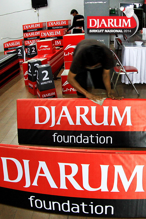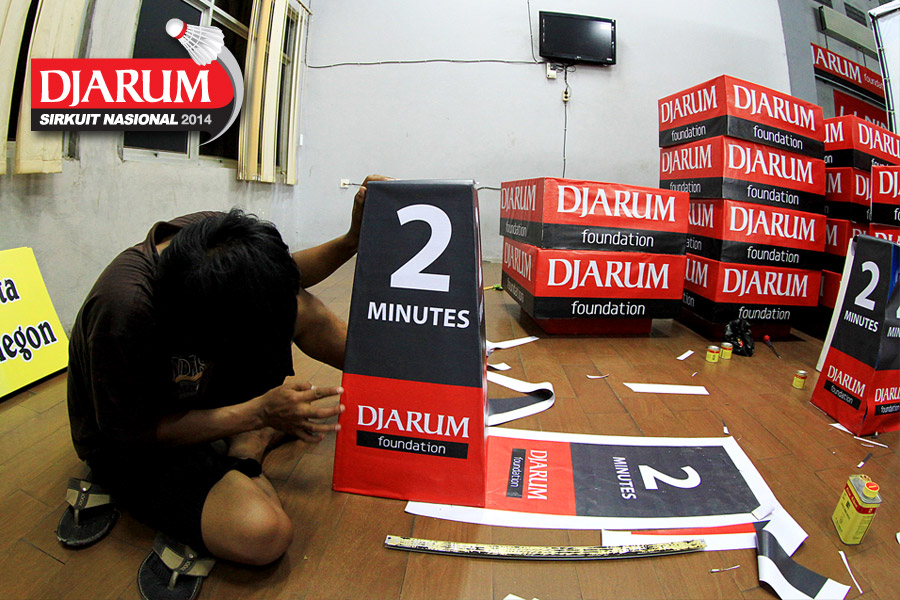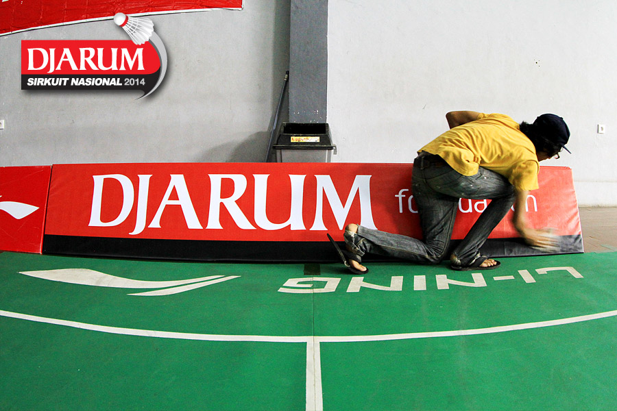 Seorang pekerja sedang menyelesaikan properti dekorasi Djarum Sirkuit Nasional Li-Ning Banten Open 2014