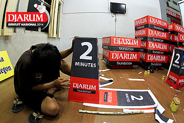 Dua orang pekerja sedang menyelesaikan properti dekorasi Djarum Sirkuit Nasional Li-Ning Banten Open 2014